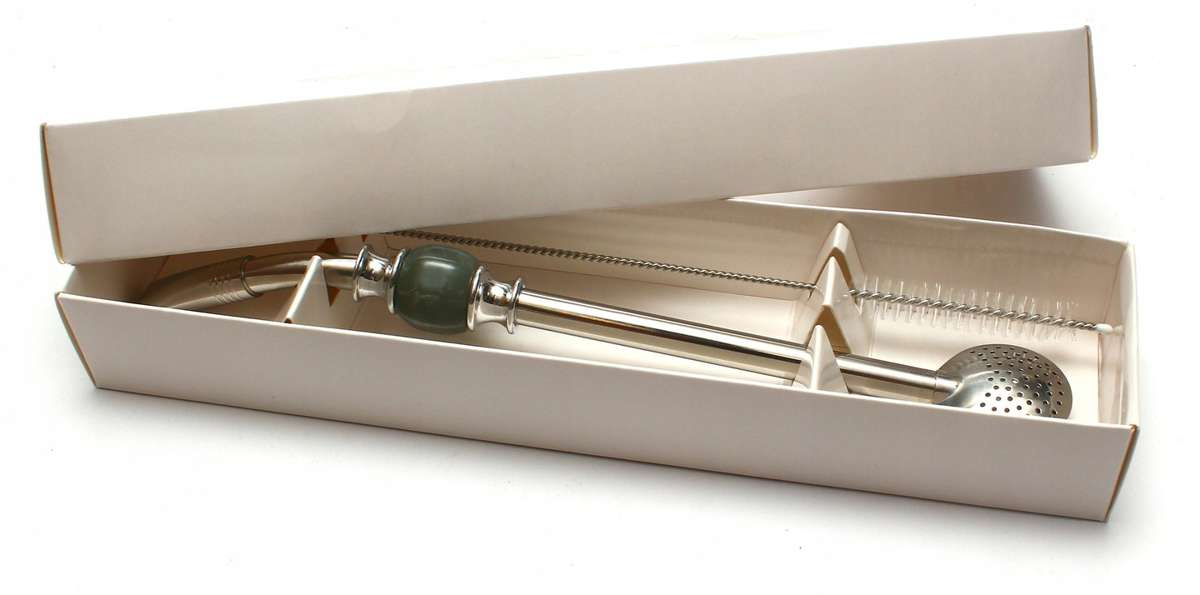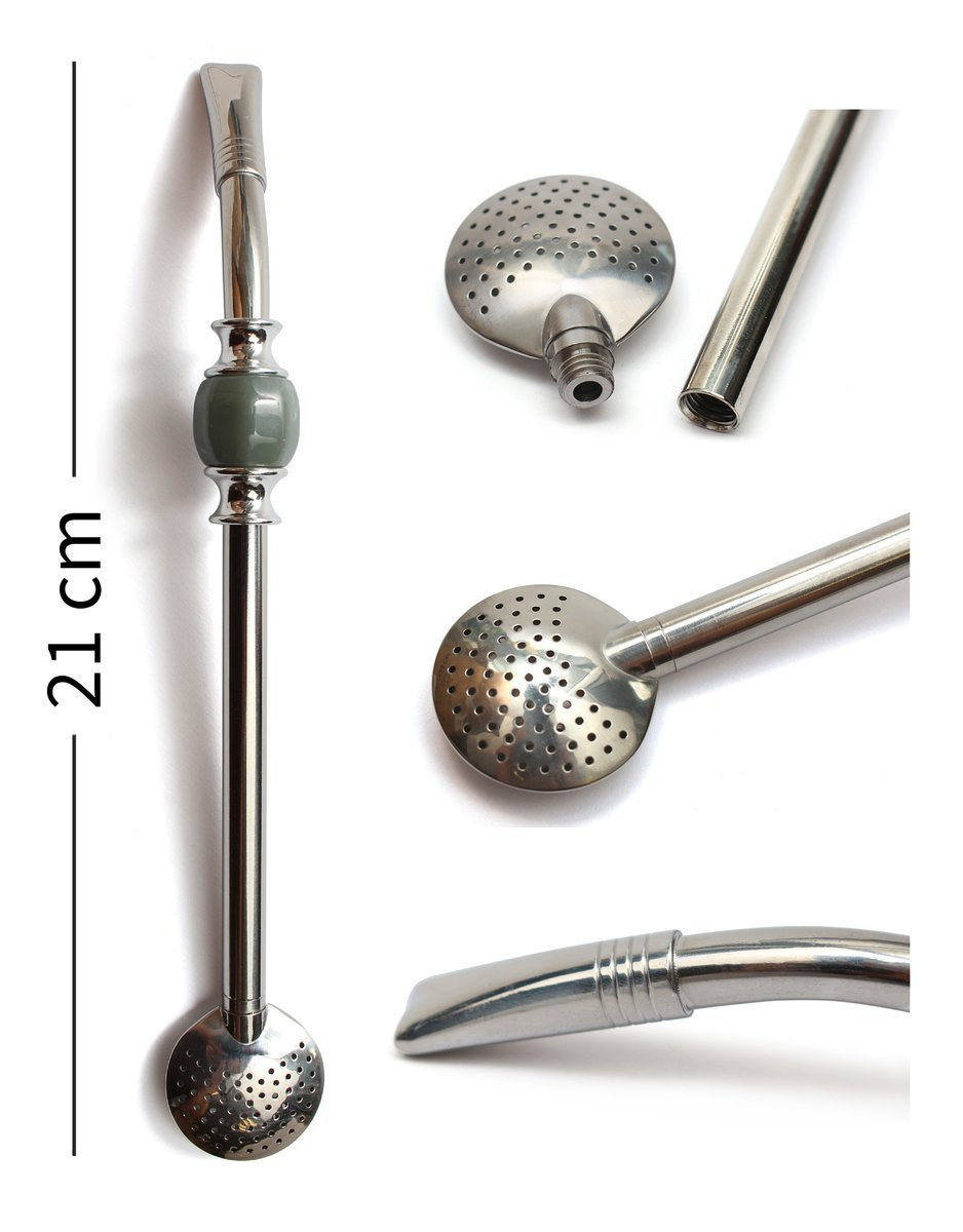• Bombilla o długości 21 cm z sitkiem o średnicy 2,8 cm. Wykonana w 100% ze stali INOX. Zdobiona dwoma pierścieniami chłodzącymi i szarym kamieniem. Do bombilli dołączona jest szczoteczka, a całość zapakowana jest w tekturowe pudełko.