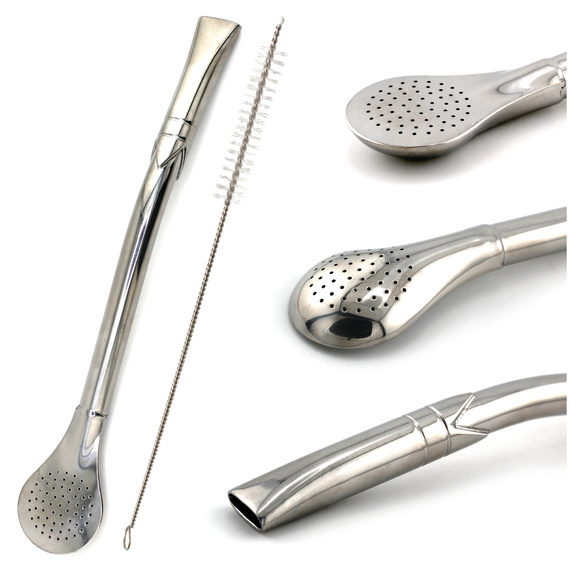 • Nierdzewna, profilowana bombilla z sitkiem - łyżeczką, wykonana ze stopu stali nierdzewnej INOX. Długość 19 cm. Idealna do mater ceramicznych i naczyń z drewna np Palo Santo.