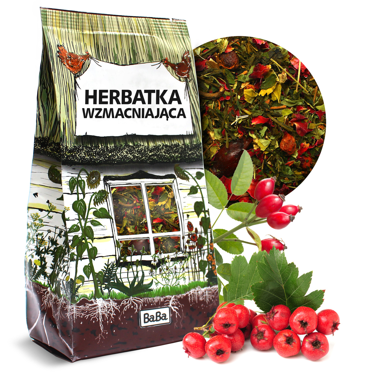 Składniki: herbata Sencha 20% - kraj poch. Chiny, głóg owoc, róża owoc, papaja liść, moringa liść, tarnina owoc, pokrzywa liść, płatki róży.