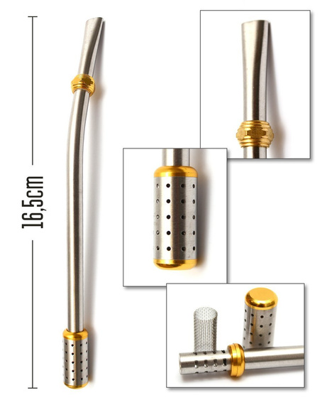 • Nierdzewna bombilla z potrójnym systemem filtrowania na który składają się: zewnętrzny płaszcz z nawierconymi otworkami, metalowe sitko odrobnych oczkach i otworki na rurce. Długość 16,5 cm. Polecana szczególnie szczególnie do drobno mielonego suszu.