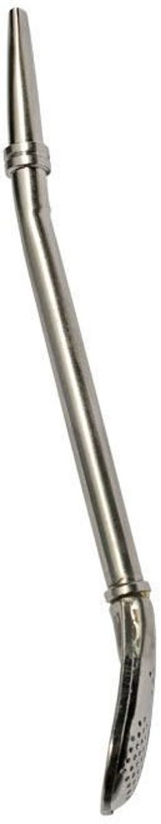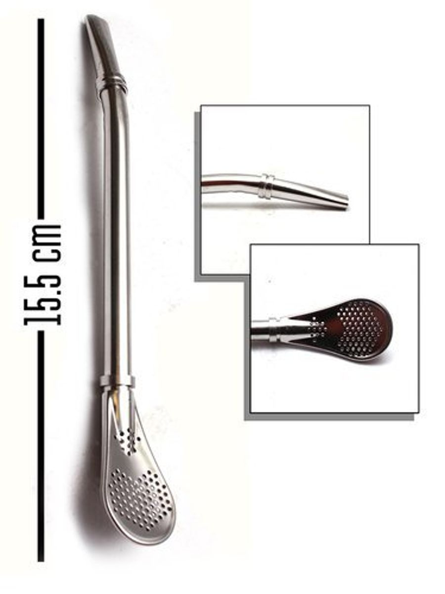 • Delikatnie profilowana bombilla z sitkiem typu "łyżeczkowego" wykonana ze stopu stali nierdzewnej. Długość 15,5 cm cm. Idealna do naczyń z tykwy i Palo Santo. Posiada dwa pierścienie: pierwszy przy sitku, a drugi przy ustniku.