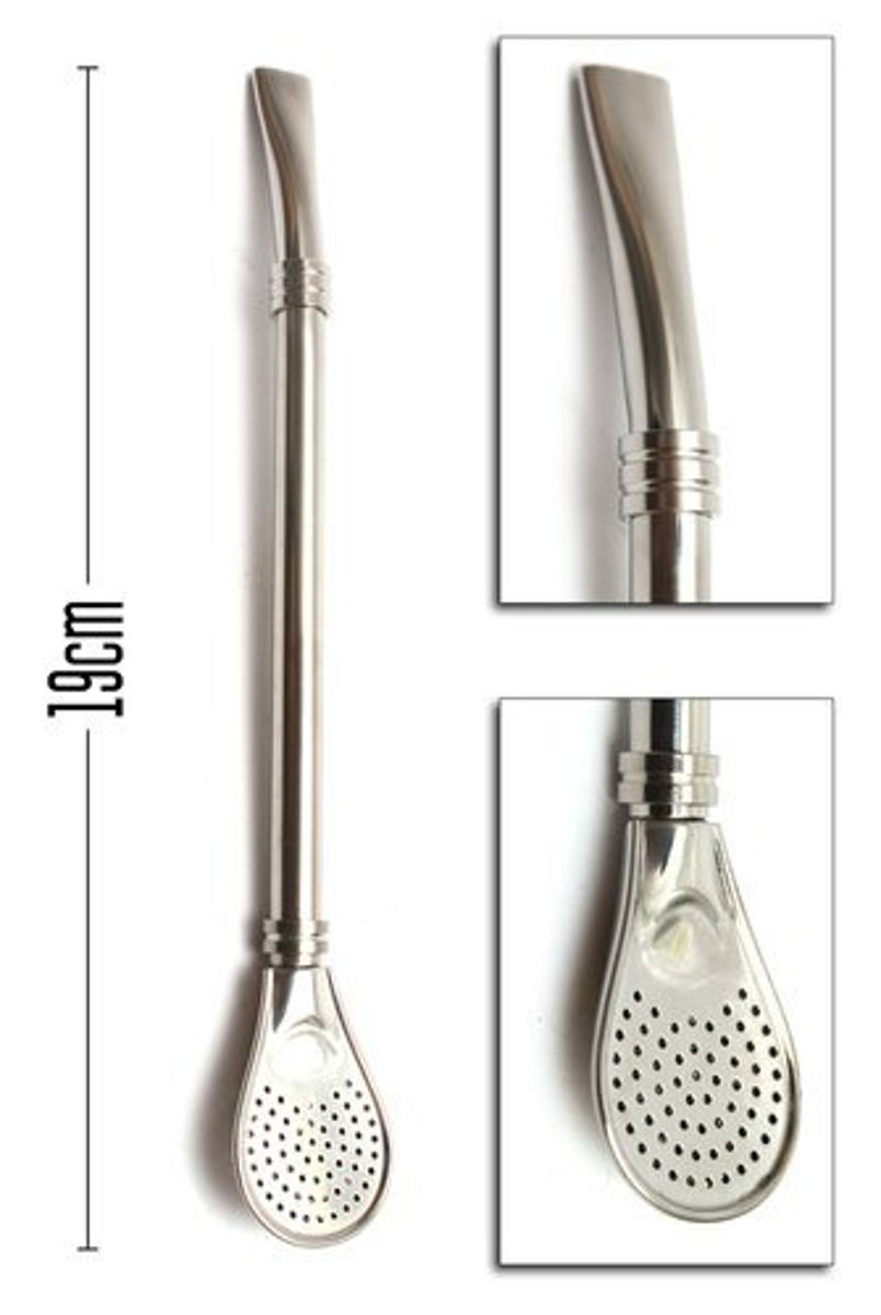 • Rozkręcana bombilla wykonana ze stali nierdzewnej ze srebrnym pierścieniem przy ustniku. Posiada filtr - sitko w kształcie łyżeczki. Długość 19 cm. Idealna do mater ceramicznych i średniej wielkości tykw.