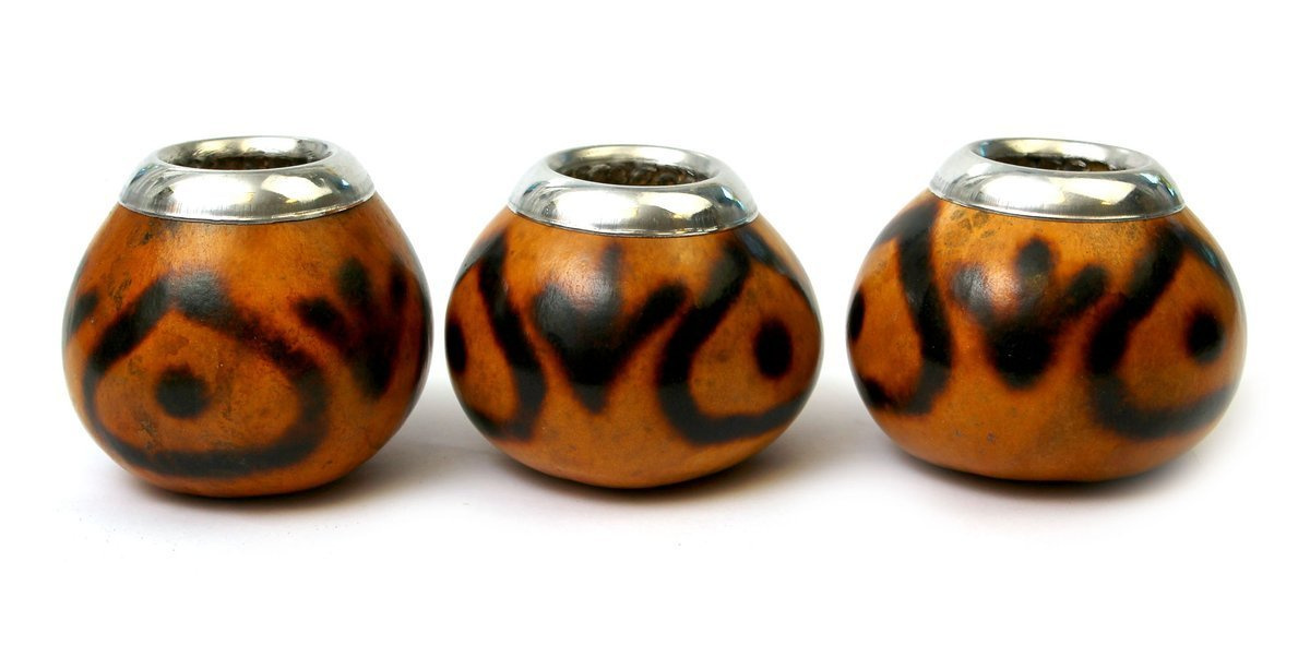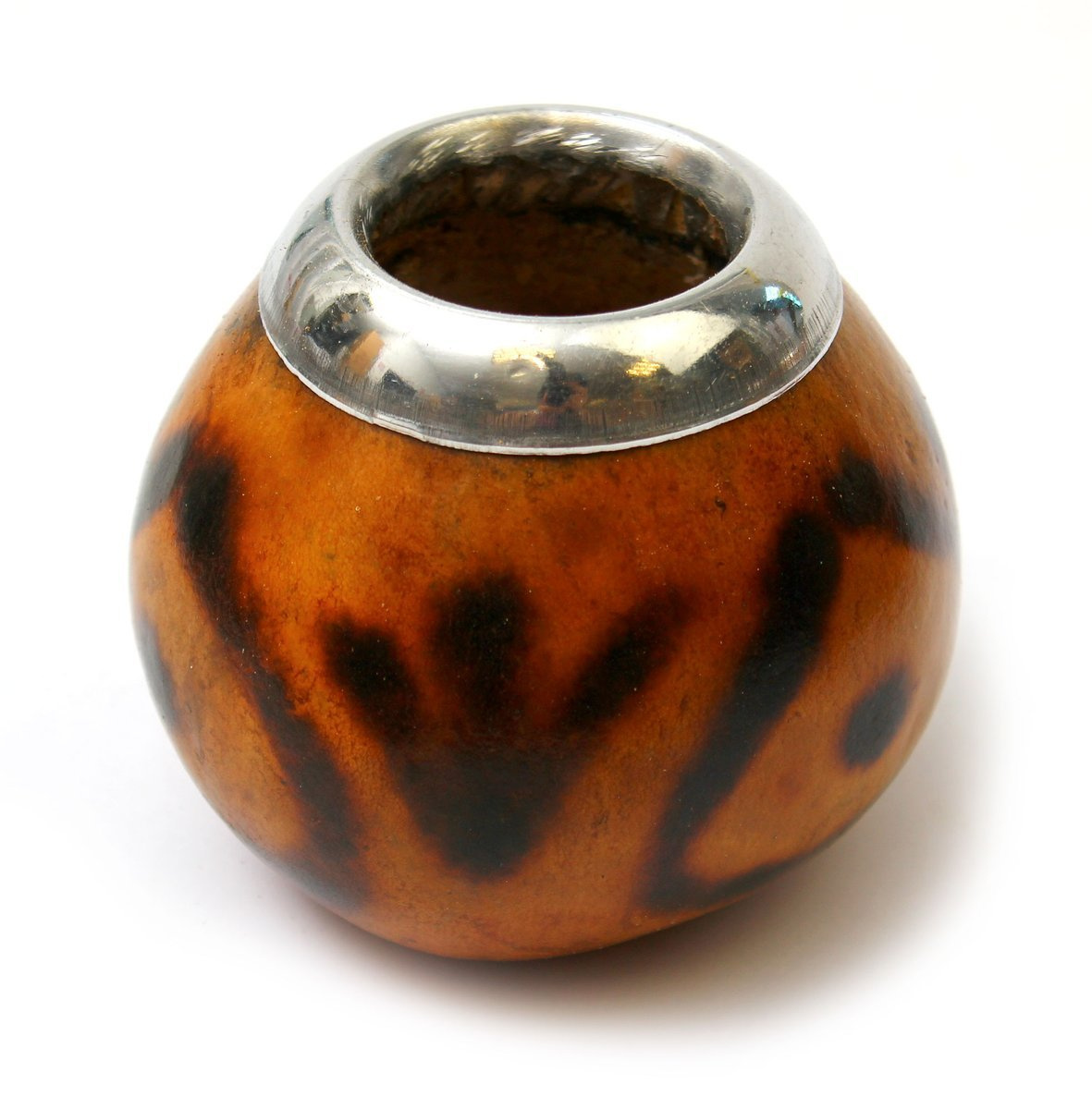 • Klasyczna tykwa (calabaza) z dekoracyjnym okuciem. Gustowna i trwała, zdobiona przy pomocy ognia w trójkątne wzory.