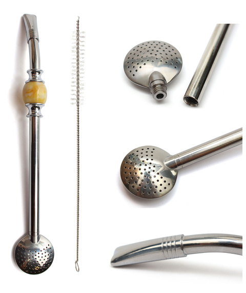 • Bombilla o długości 21 cm z sitkiem o średnicy 2,8 cm. Wykonana w 100% ze stali INOX. Zdobiona dwoma pierścieniami chłodzącymi i żółtawym kamieniem z przebarwieniami. Do bombilli dołączona jest szczoteczka, a całość zapakowana jest w tekturowe pudełko.