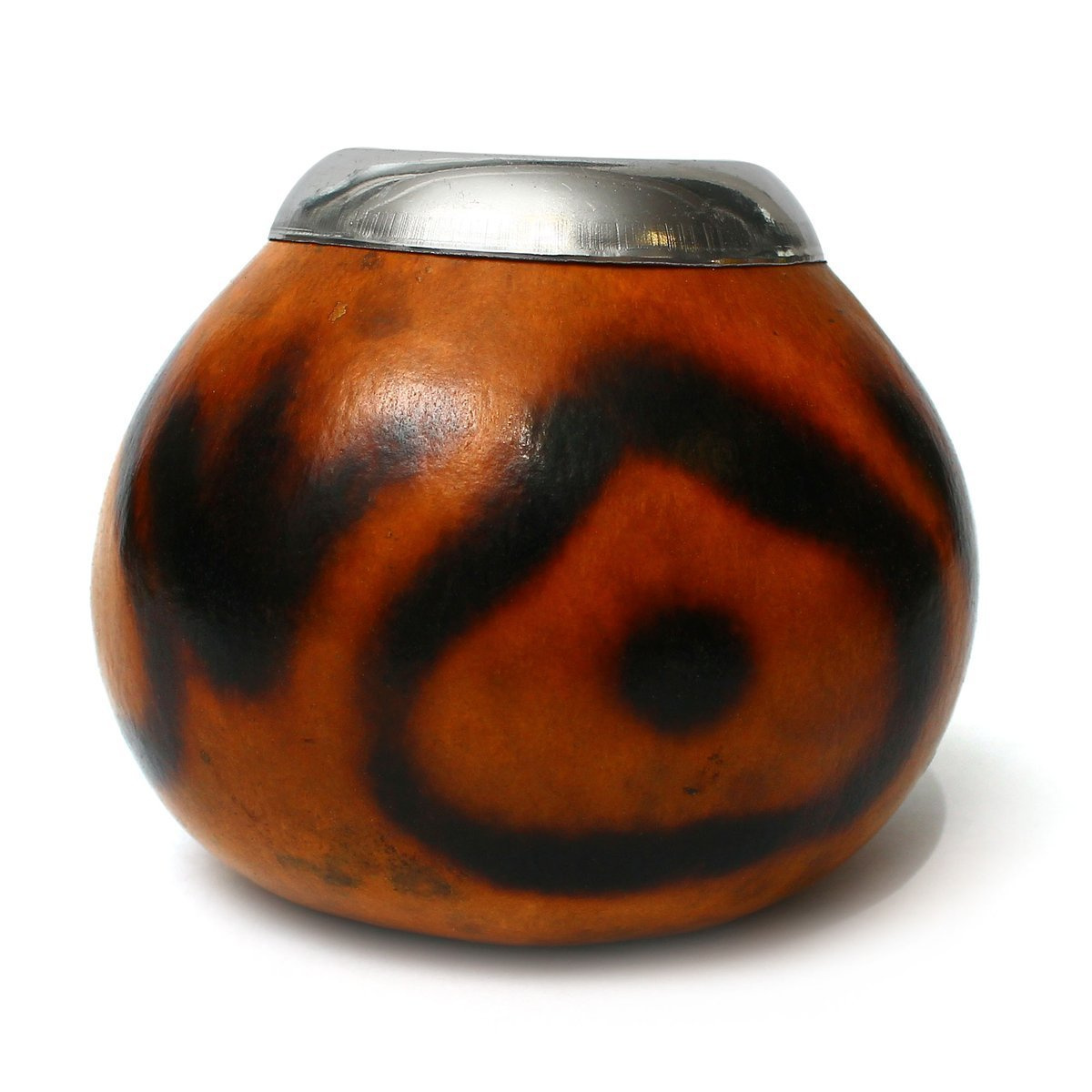 • Klasyczna tykwa (calabaza) z dekoracyjnym okuciem. Gustowna i trwała, zdobiona przy pomocy ognia w trójkątne wzory.
