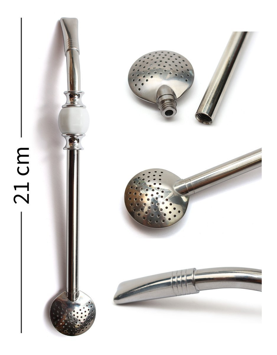 • Bombilla o długości 21 cm z sitkiem o średnicy 2,8 cm. Wykonana w 100% ze stali INOX. Zdobiona dwoma pierścieniami chłodzącymi i białym kamieniem. Do bombilli dołączona jest szczoteczka, a całość zapakowana jest w tekturowe pudełko.