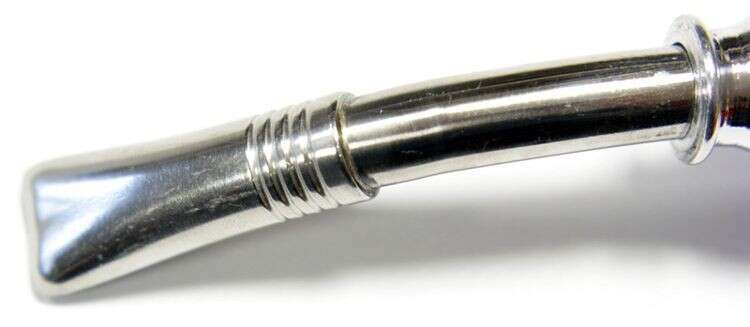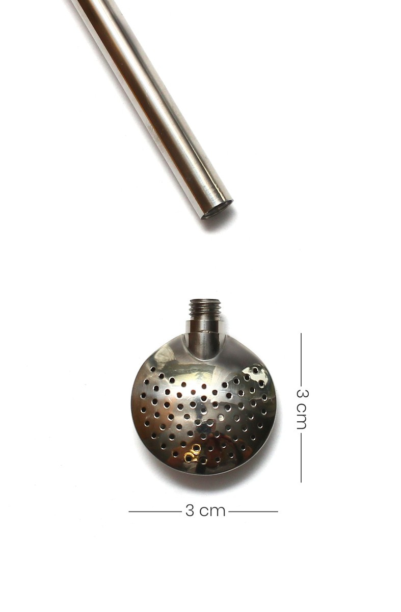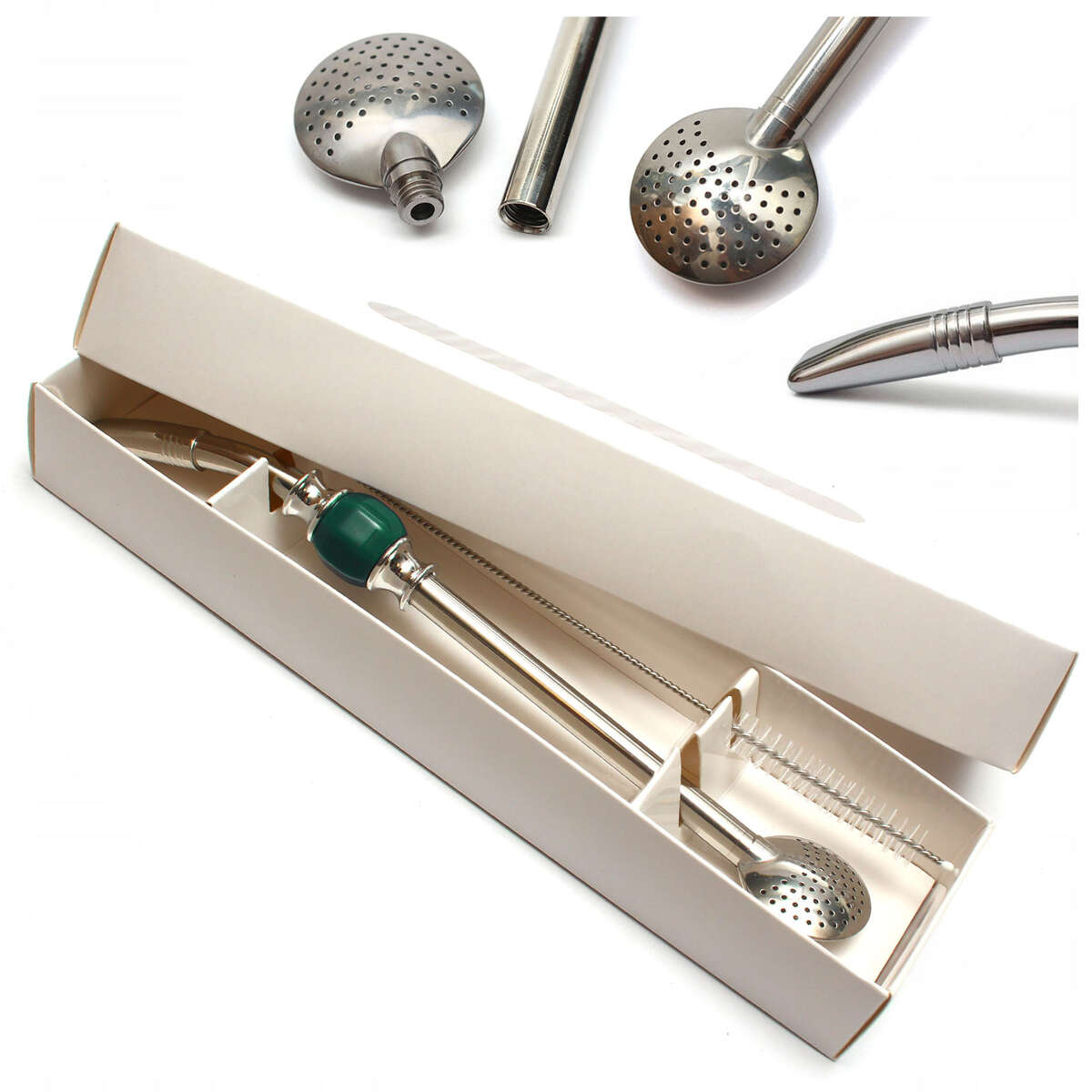 • Bombilla o długości 21 cm z sitkiem o średnicy 2,8 cm. Wykonana w 100% ze stali INOX. Zdobiona dwoma pierścieniami chłodzącymi i zielonym kamieniem. Do bombilli dołączona jest szczoteczka, a całość zapakowana jest w tekturowe pudełko.
