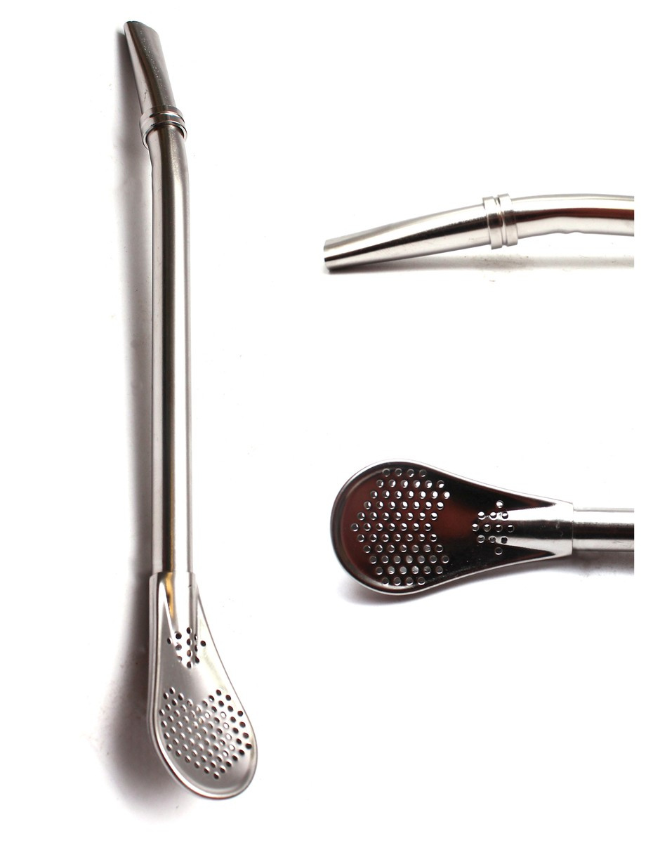 • Delikatnie profilowana bombilla z sitkiem typu "łyżeczkowego" wykonana ze stopu stali nierdzewnej. Długość 15,5 cm cm. Idealna do naczyń z tykwy i Palo Santo. Posiada dwa pierścienie: pierwszy przy sitku, a drugi przy ustniku.
